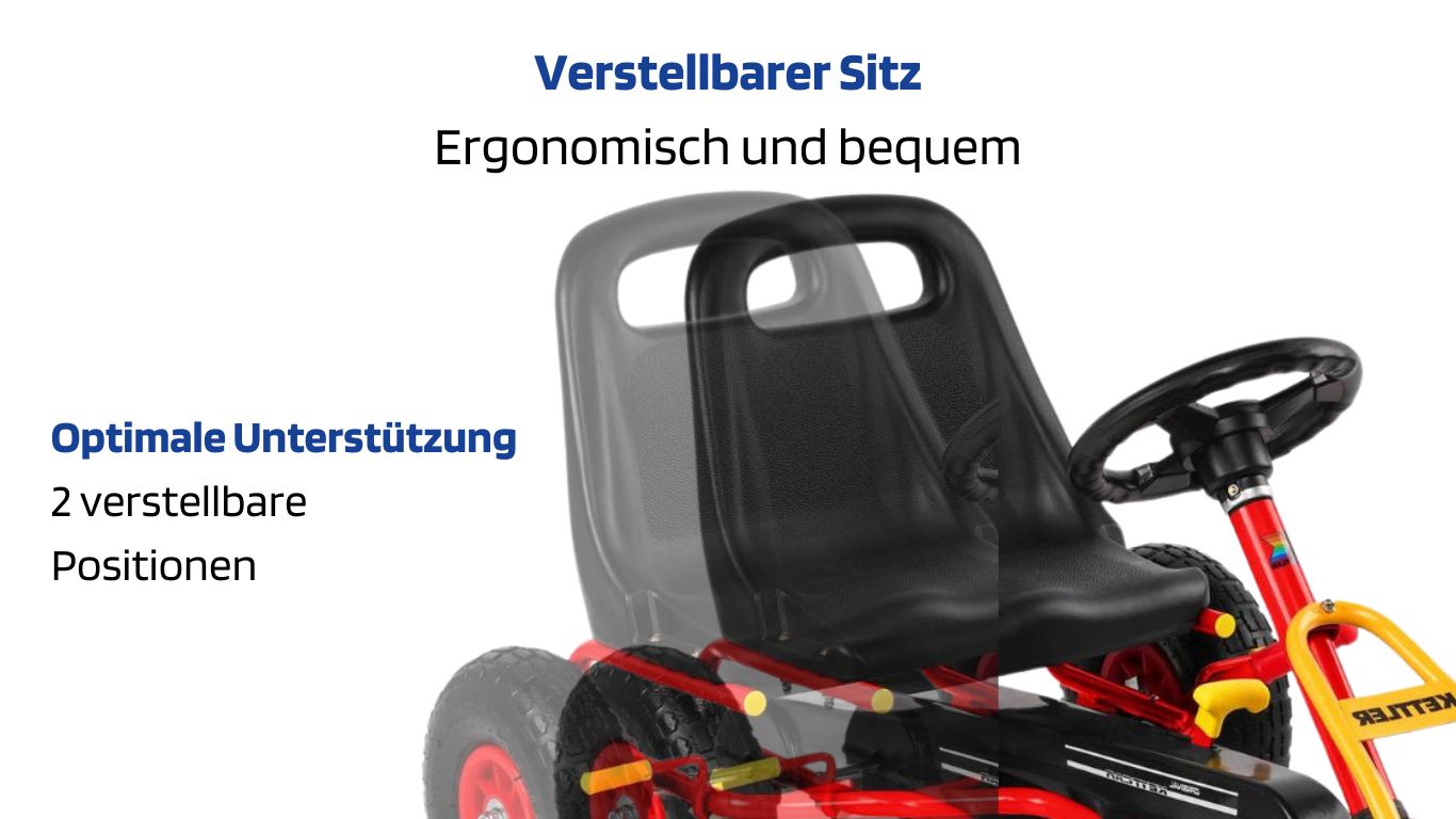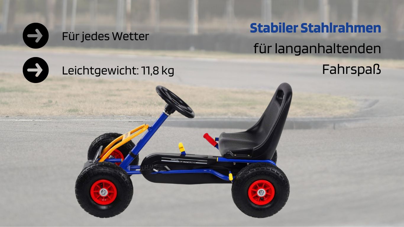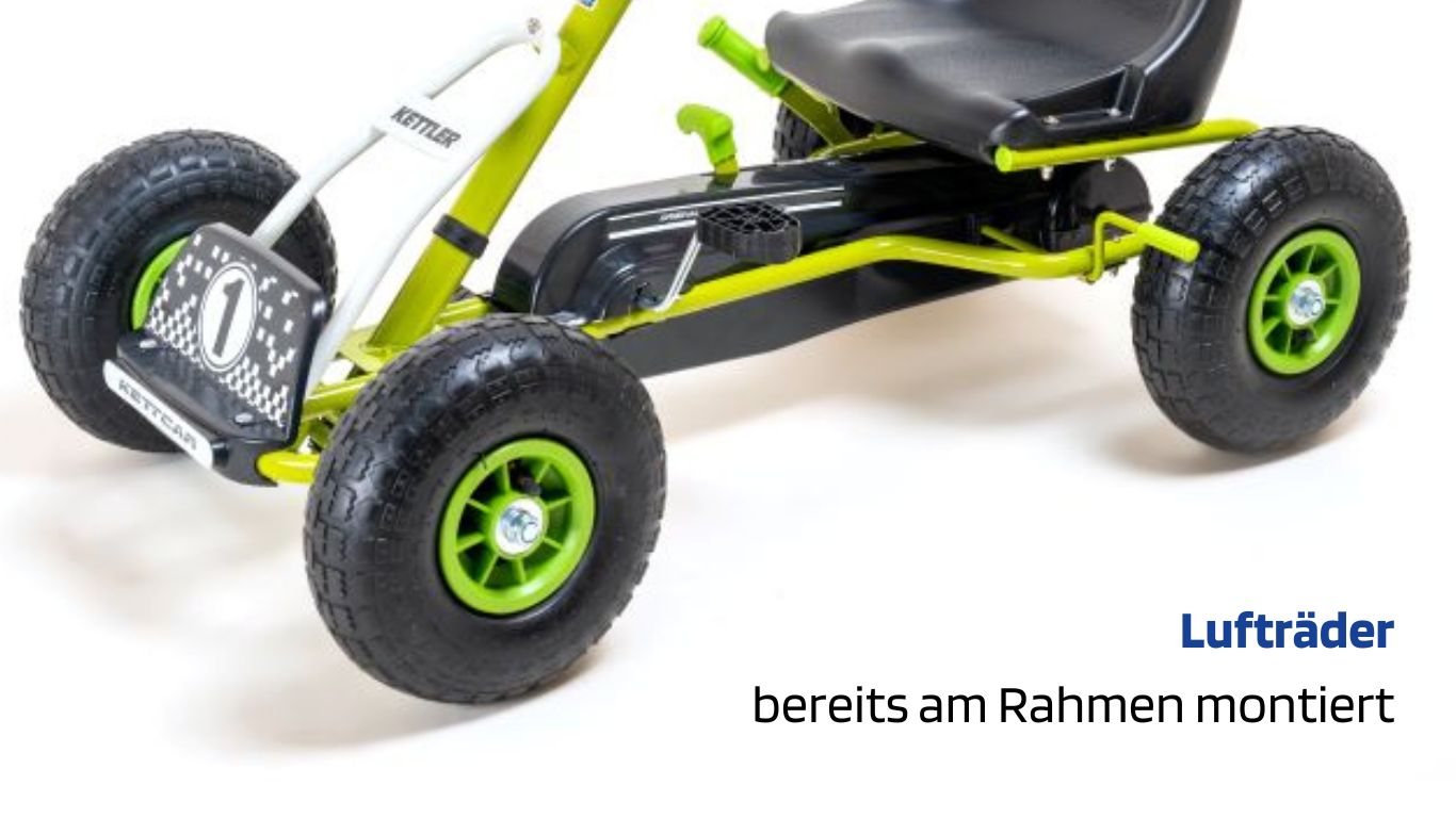 Dank 10-Zoll-Luftreifen fährt sich das Kettcar angenehm weich – auch über Kies, Rasen oder Asphalt.